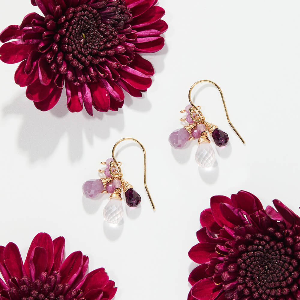 Red Garnet, Clear Quartz, and Pink Sapphire briolettes are clustered in a 14K Gold-Filled wire earring that will carry you from Summer to Fall with its colors and simplicity.