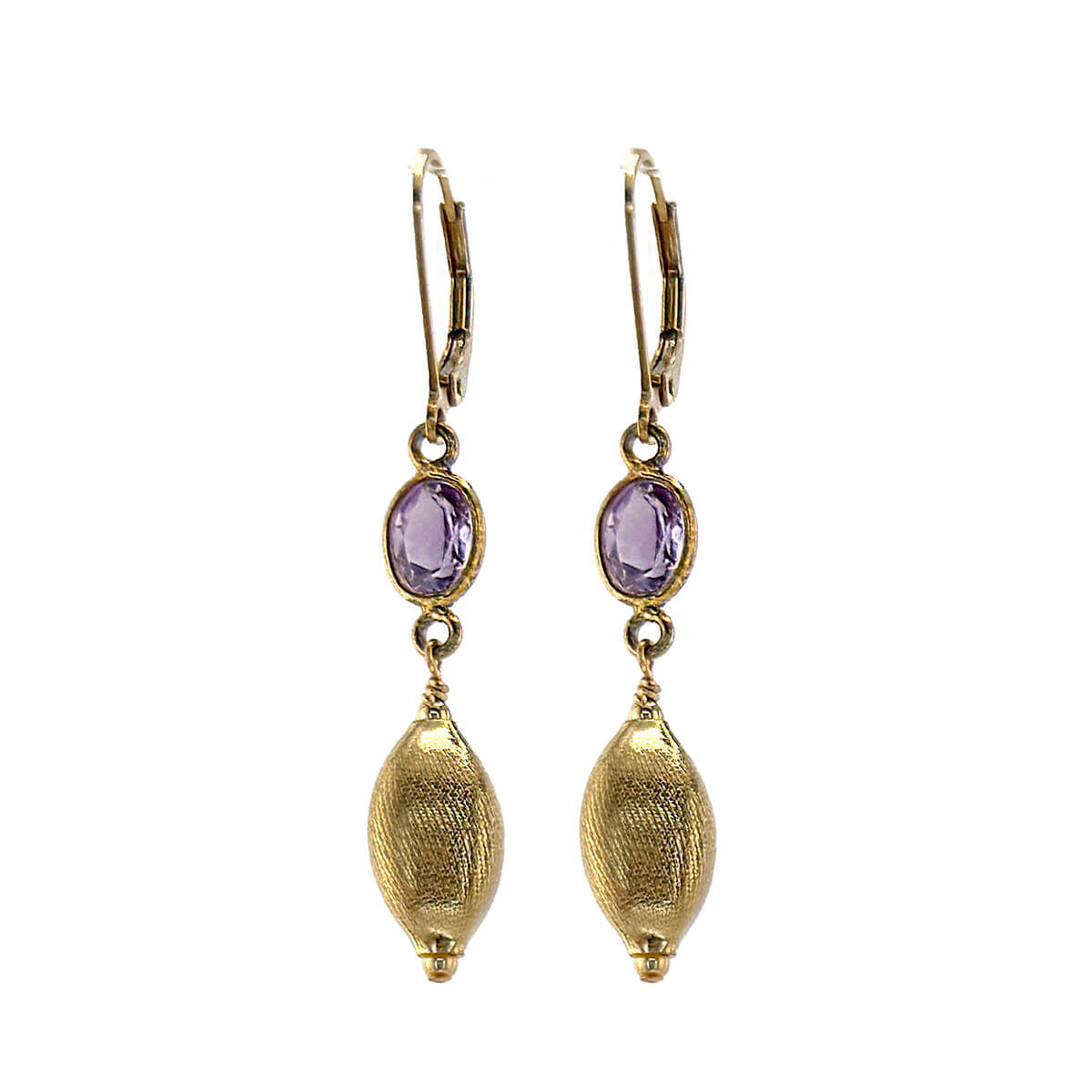 Faceted amethyst radiates calm above textured, brushed gold ovals. These earrings combine color and warmth in a sophisticated silhouette. Wear them to add a serene pop of color to your everyday look or to accent your evening style with quiet elegance: 14K GF bezels and ear wires.