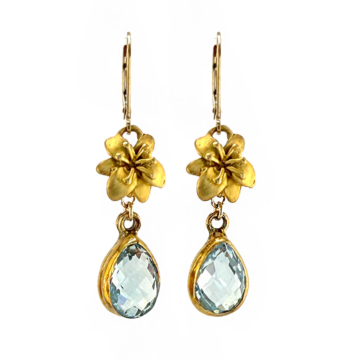 Radiant bezel set blue topaz gemstones bloom from golden vermeil petals in a graceful floral design. These earrings are joyful, feminine, and full of life. A beautiful way to brighten winter whites or complement soft blues and pinks. Perfect for day-to-evening wear. 14K gold fill lever backs, 14K vermeil flowers.