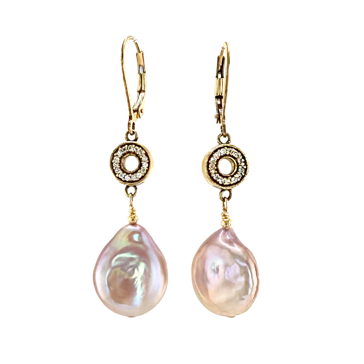 Large baroque coin pearls shimmer with natural iridescence beneath white topaz accents that catch the light beautifully. Their organic shapes and soft glow make every pair unique. These are a stunning choice with both casual linen or an elegant gown. Their luminous finish flatters every skin tone and style. 14K gold-fill setting and lever backs.