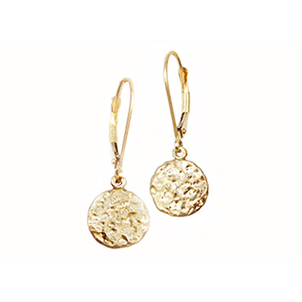 Simple and easy to wear, 14k yellow gold 10mm textured discs dangle from a secure lever back. The texture adds a lovely glow. A great pair of earrings for your jewelry box.