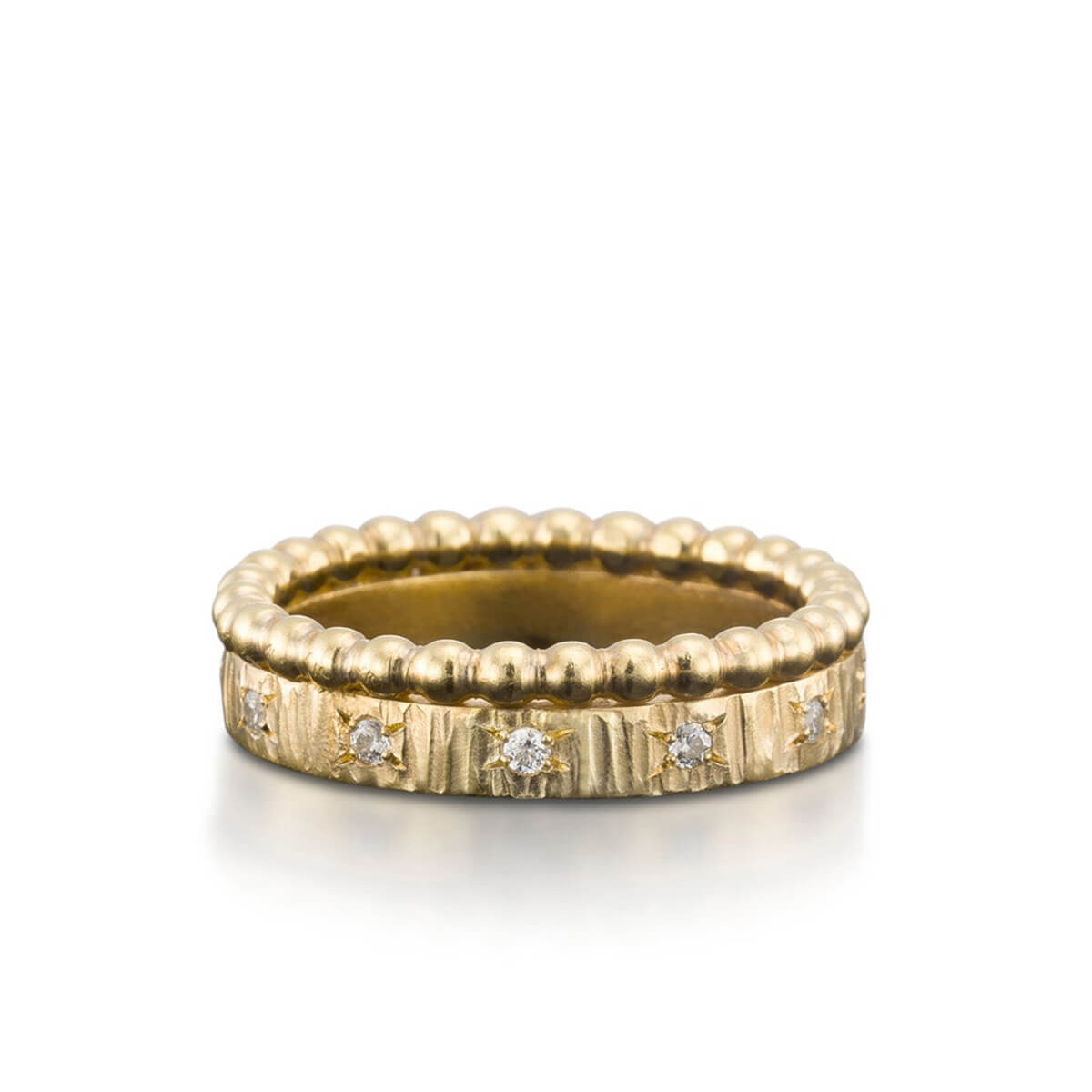 Feel like royalty when you wear this textured, matte finish gold crown band. It can be stacked easily with another ring or worn alone. Either way, you will want to have this beautifully crafted ring in your jewelry case. The 4.5 mm band is textured and topped with a series of delicate scalloped balls. To add a bit of flourish, ten small diamonds are then flush-set in the band.