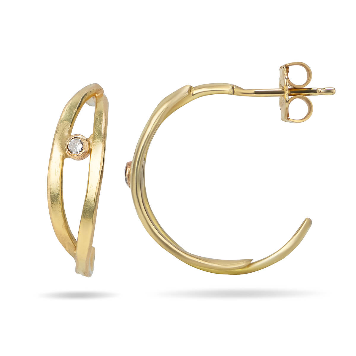 Hand-forged strips of shimmering 18K yellow gold, then a sparkling 1.5mm diamond set between two pieces, like a jeweled berry between branches. Hoops are approximately one inch in diameter, and come with 18K post and backs. Lightweight… wear with everything… what’s not to love? Add these to your collection today.
