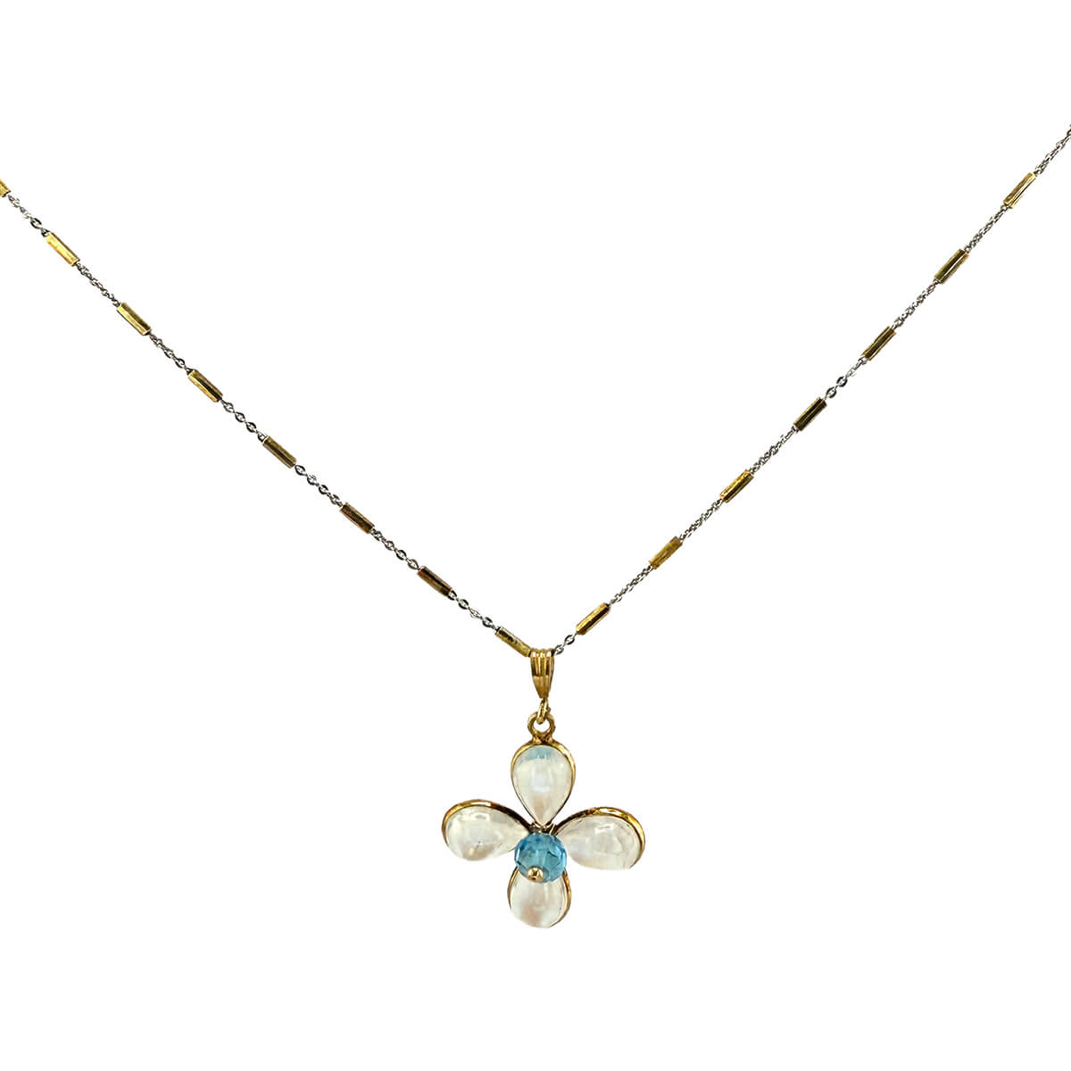 Such a sweet pendant with just the right aesthetic for everyday wear. Softly glowing moonstone petals surround a center of brilliant blue topaz, creating a radiant floral centerpiece. The combination of shimmer and sparkle gives this necklace a dreamy, romantic presence. Layer with other gold chains for a modern look, or wear alone with an open neckline for effortless elegance. The chain is a variant of textures in 14K yellow gold fill and sterling silver, adding another element of interest to a special one-of-a-kind pendant.