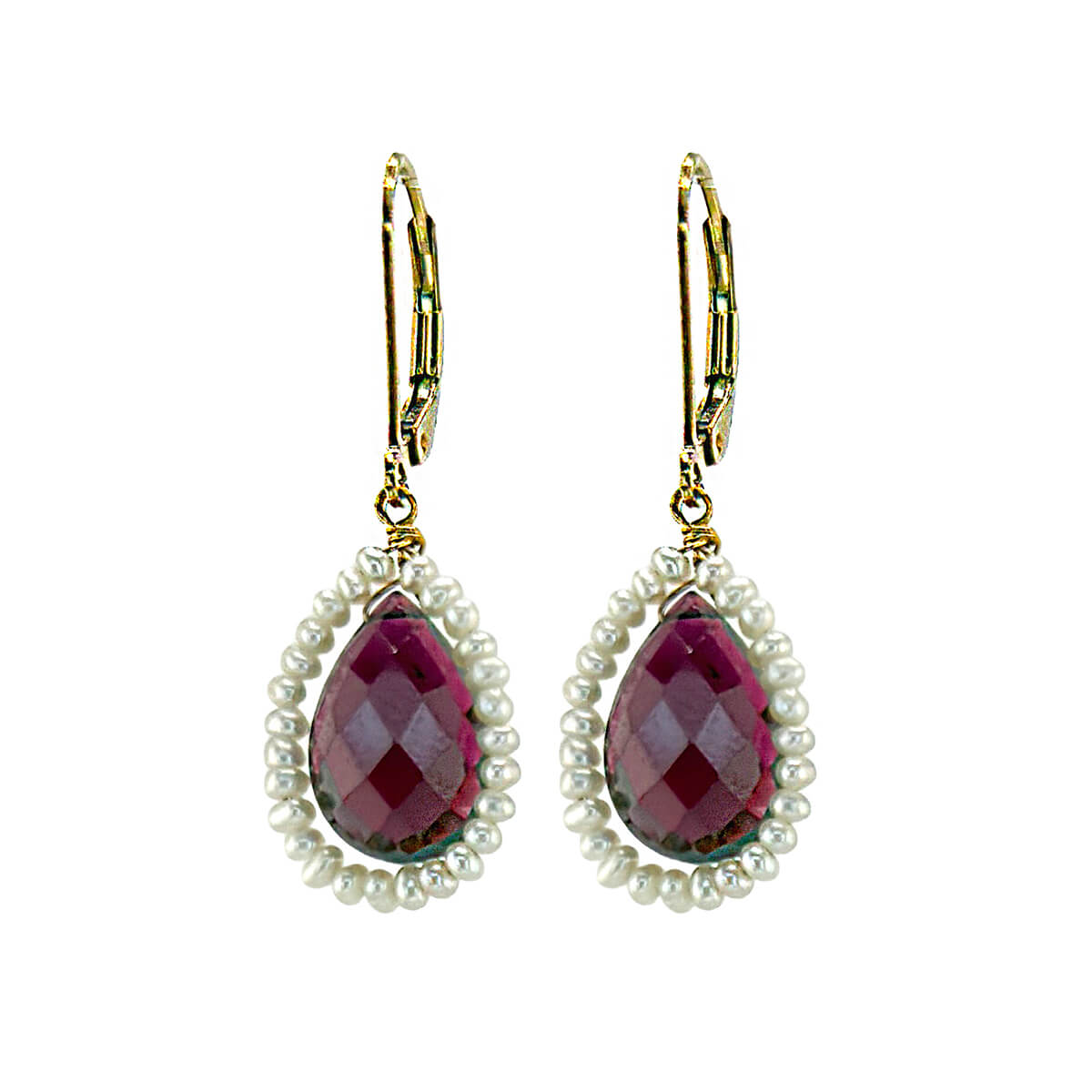 Rich red garnets are the focal point, circled by creamy pearls, in an elegant teardrop design. Each earring glows with warmth and depth. These are dainty yet daring. Perfect with winter knits or an evening out, or whenever you want to add a romantic feel to your outfit. 14K gold fill lever backs.
