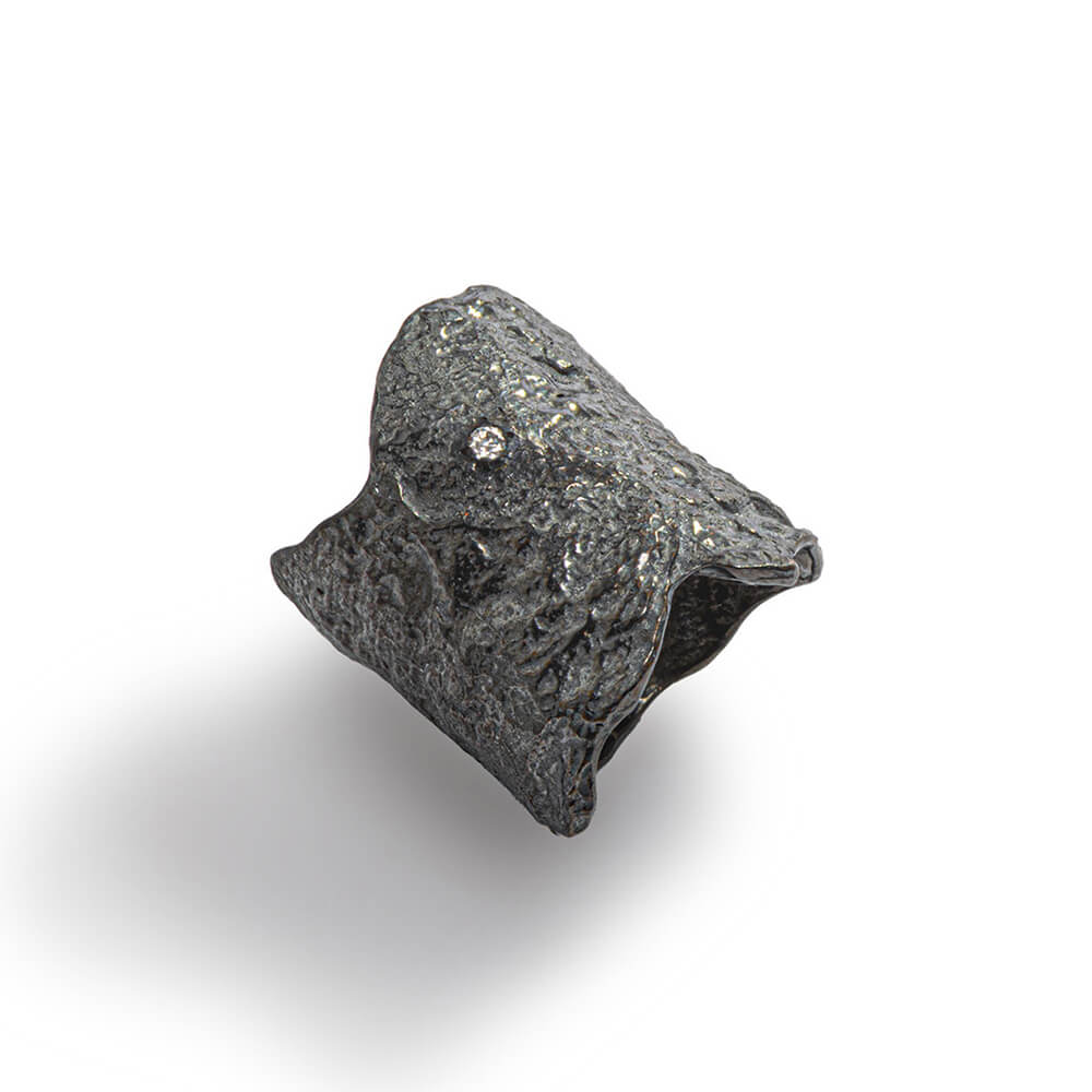 Large and sculptural, it’s crafted in richly textured blackened sterling silver, with organic, irregular edges that give it a raw, powerful presence. And then—just a small diamond, like a quiet flash of light within the darkness.