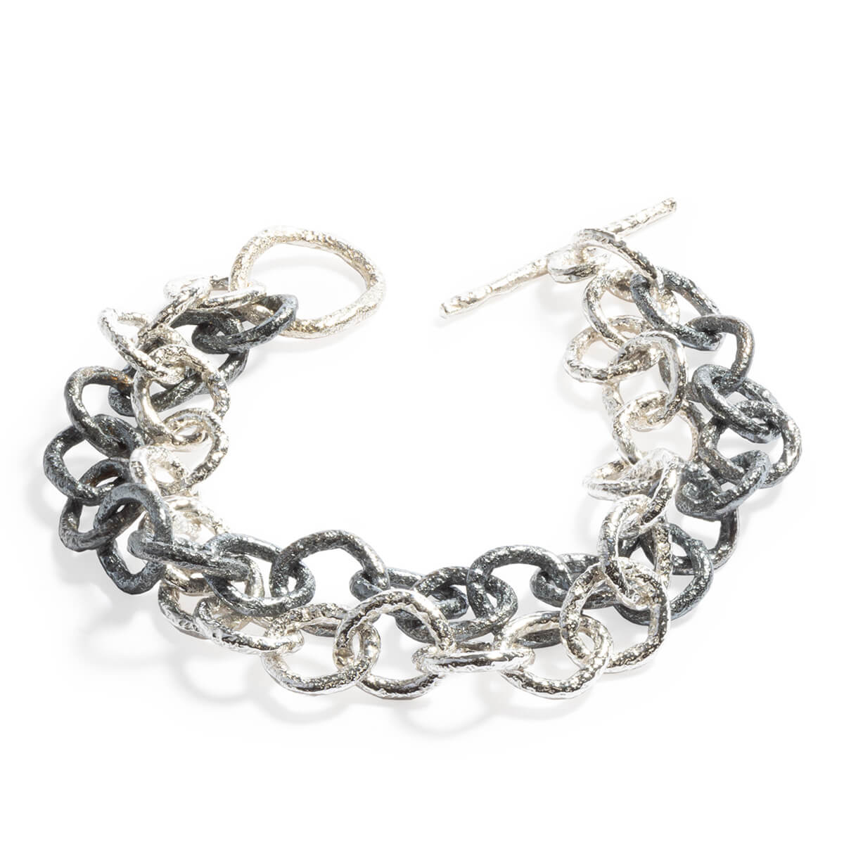 The Good Vibes bracelet plays with contrast in the most striking way—blackened and white textured sterling silver links woven together in a bold, rhythmic design. There’s something so modern about that balance of light and dark.